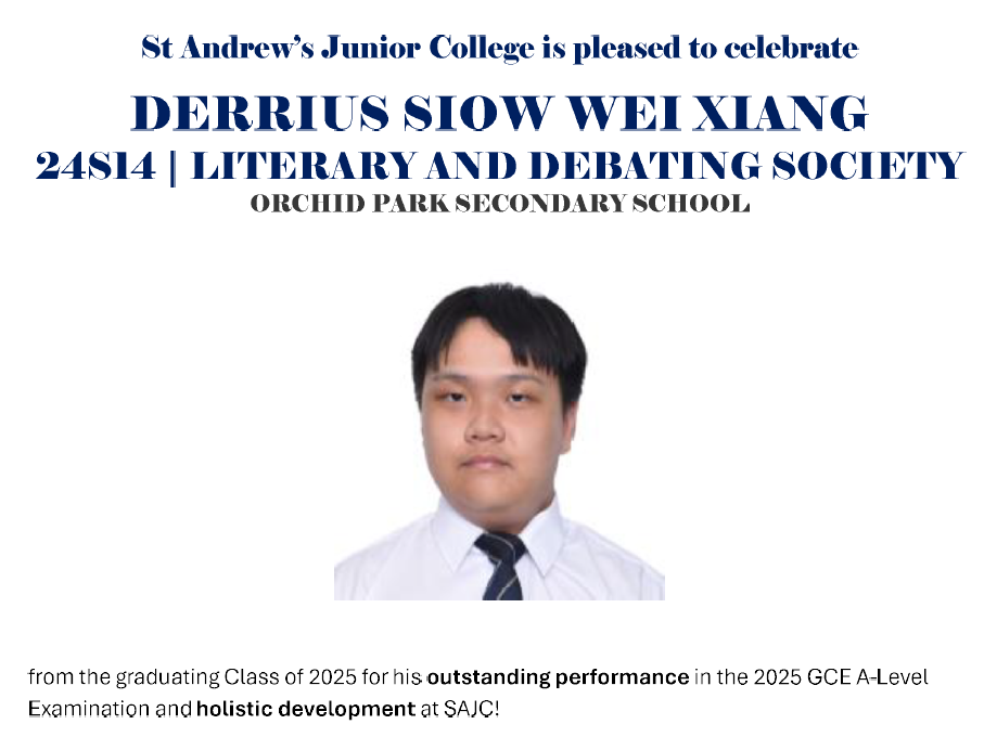 We are proud to announce that Derrius Siow Wei Xiang (Class of 2023) has achieved a perfect score of 70 rank points in his A-Level examinations at St Andrew's Junior College.